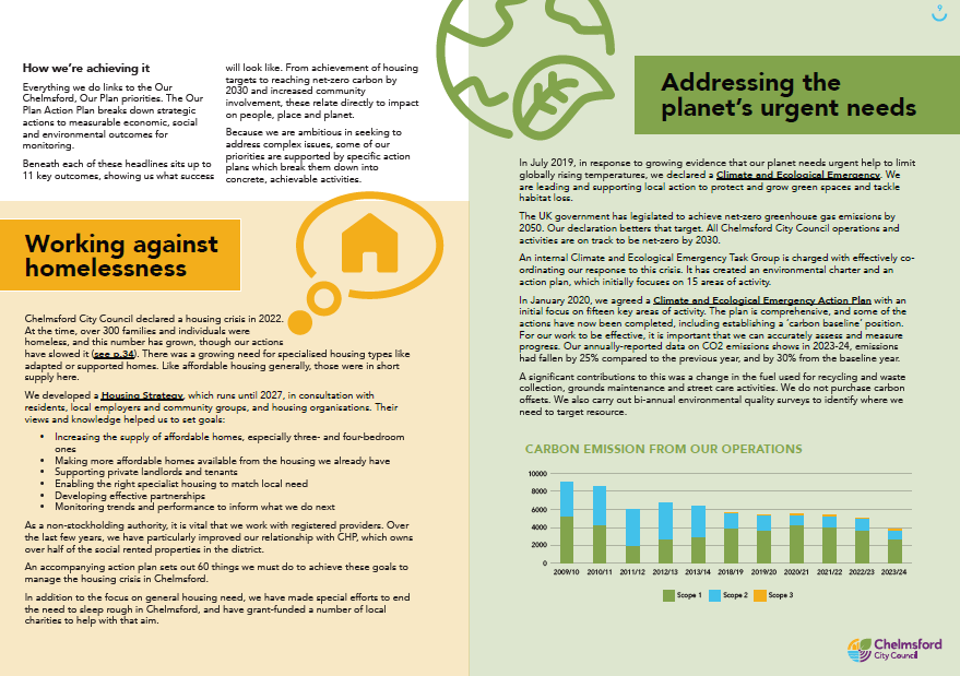 To illustrate the copy, we used real images of the local community, clear diagrams and charts, and friendly, bright, accessible graphics which echoed the council’s well-recognised logo. The overall feel of the document brings together the Chelmsford values of honesty, positivity, clarity, collaboration and creativity.